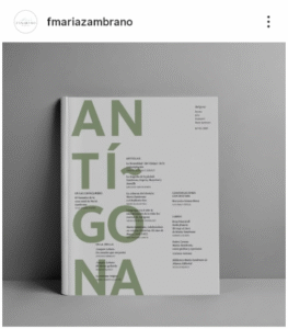 La Revista Antígona es un medio creado para difundir el pensamiento de María Zambrano a través de artículos, investigaciones, entrevistas, etc. La revista Antígona, tiene una versión en papel con ocho números ya impresos y en su nueva etapa pasa a compartir lugar con la versión digital que se podrá obtener a través de su web.